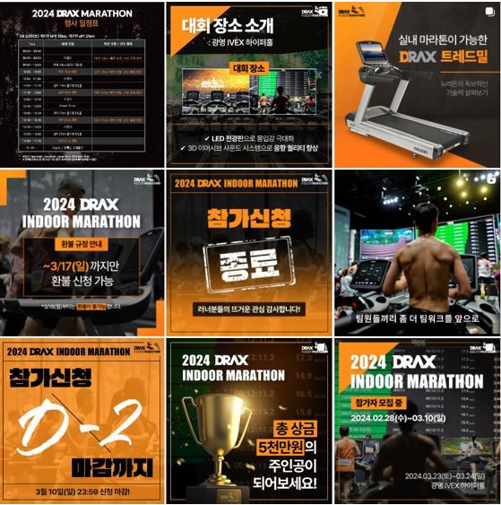 2023.04 ~ Present디랙스 트레드밀 마라톤 SNS 채널 운영 및 홍보 - 세계 최초 실내 트레드밀 마라톤 대회의 인지도를 전파할 수 있도록 홍보 채널 구축 - 대회 홍보, 참여 극대화를 위해 대회 전후로 콘텐츠 제작 및 온라인 광고 운영 - 실내 마라톤 대회의 성지라는 이미지를 구출할 수 있도록 보도자료 배포 및 스포츠 매체를 통한 기획 기사, 사진 기사 등 PR 활동 동시 진행